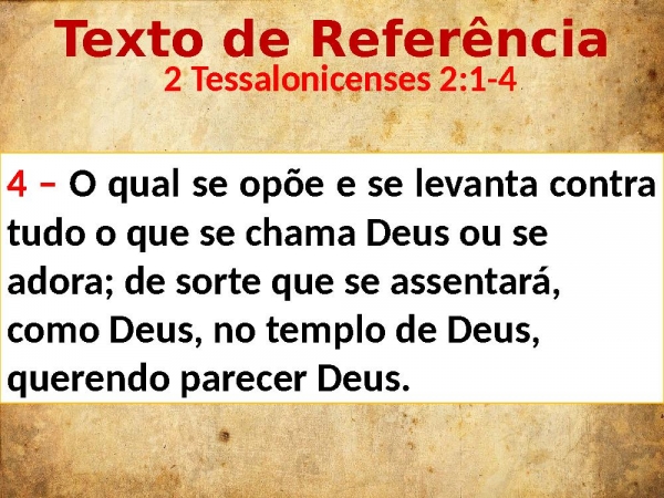 - Texto de Referência 2 Tessalonicenses 2:1-44 – O qual se opõe e se levanta contra tudo o que se chama Deus ou se adora; de sorte que se assentará, como Deus, no templo de Deus, querendo parecer Deus.