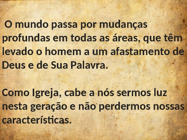 - O mundo passa por mudanças profundas em todas as áreas, que têm levado o homem a um afastamento de Deus e de Sua Palavra.Como Igreja, cabe a nós sermos luz nesta geração e não perdermos nossas características.