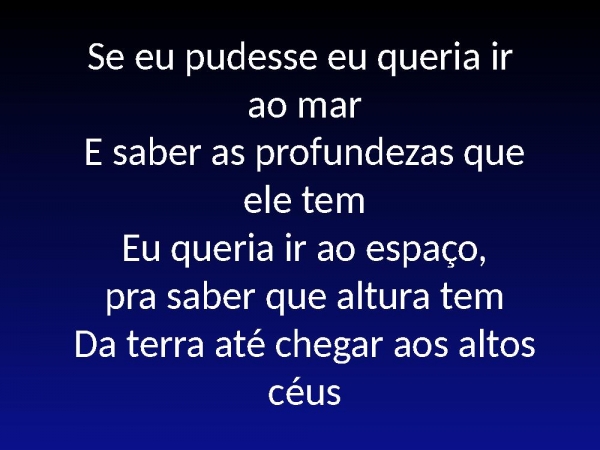 - Se eu pudesse eu queria ir ao marE saber as profundezas que ele temEu queria ir ao espaço,pra saber que altura temDa terra até chegar aos altoscéus