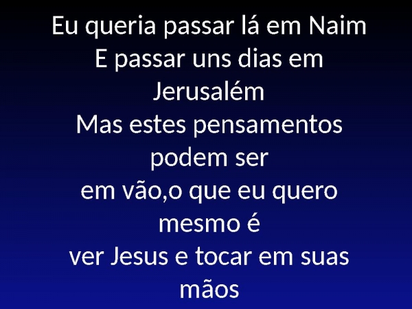 - Eu queria passar lá em NaimE passar uns dias em JerusalémMas estes pensamentos podem serem vão,o que eu quero mesmo éver Jesus e tocar em suas mãos