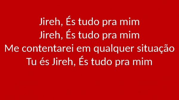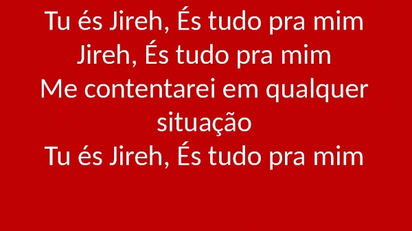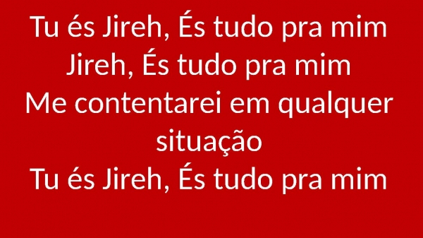 - Tu és Jireh, És tudo pra mimJireh, És tudo pra mimMe contentarei em qualquer situaçãoTu és Jireh, És tudo pra mim