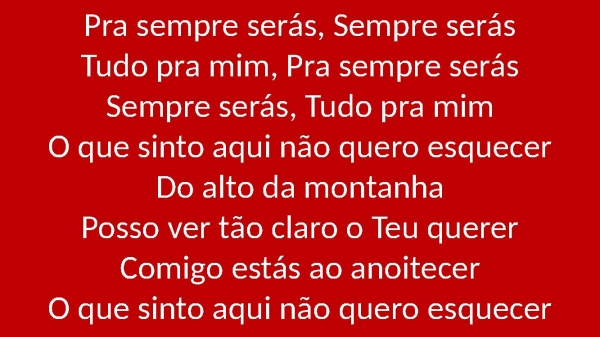 - Pra sempre serás, Sempre serásTudo pra mim, Pra sempre serásSempre serás, Tudo pra mimO que sinto aqui não quero esquecerDo alto da montanhaPosso ver tão claro o Teu quererComigo estás ao anoitecerO que sinto aqui não quero esquecer