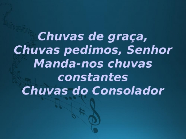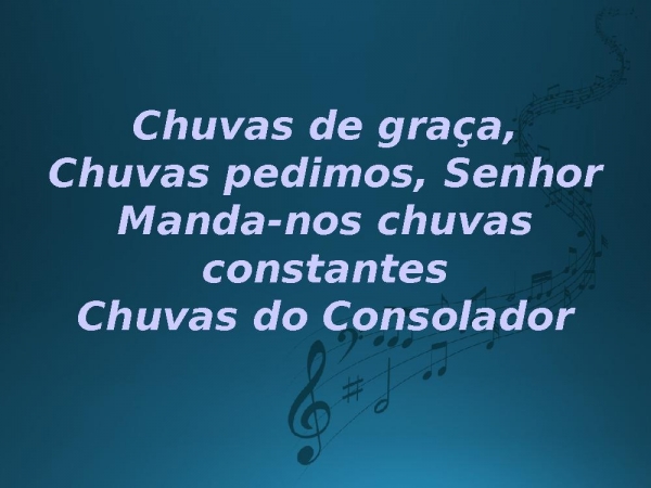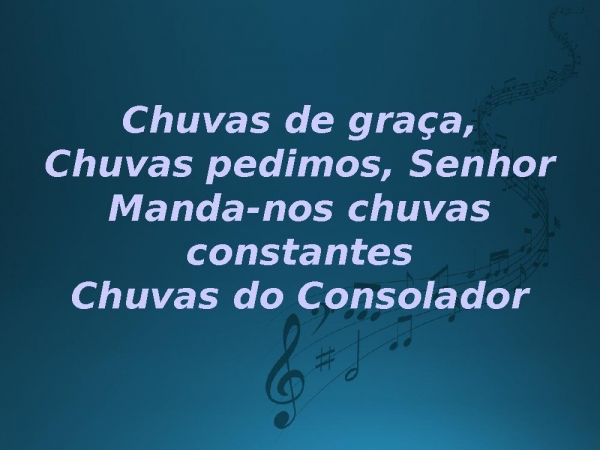 - Chuvas de graça,Chuvas pedimos, SenhorManda-nos chuvas constantesChuvas do Consolador
