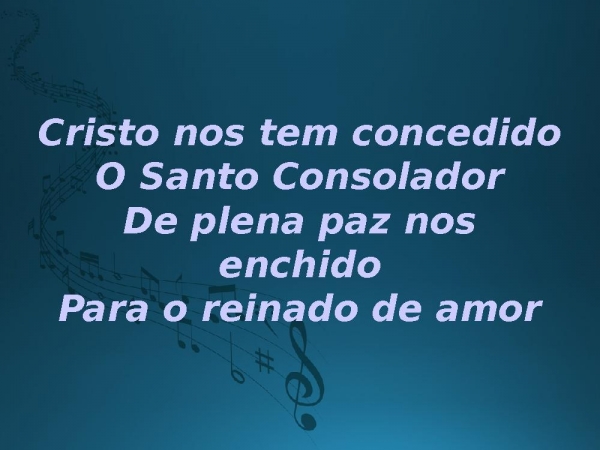 - Cristo nos tem concedidoO Santo ConsoladorDe plena paz nos enchidoPara o reinado de amor