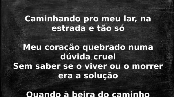 - Caminhando pro meu lar, na estrada e tão sóMeu coração quebrado numa dúvida cruelSem saber se o viver ou o morrer era a soluçãoQuando à beira do caminho apareceu Jesus
