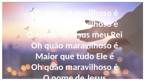 - Oh quão maravilhoso éOh quão maravilhoso éO nome de Jesus meu ReiOh quão maravilhoso éMaior que tudo Ele éOh quão maravilhoso éO nome de Jesus