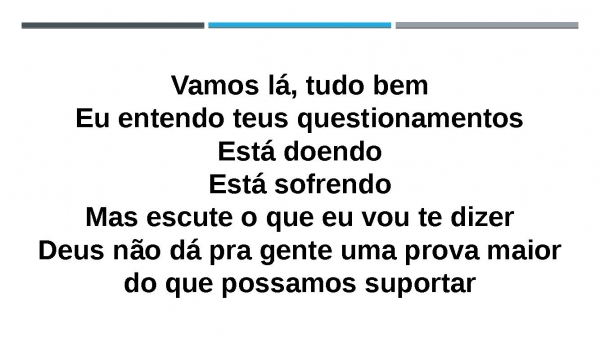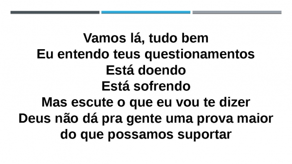- Vamos lá, tudo bemEu entendo teus questionamentosEstá doendoEstá sofrendoMas escute o que eu vou te dizerDeus não dá pra gente uma prova maior do que possamos suportar