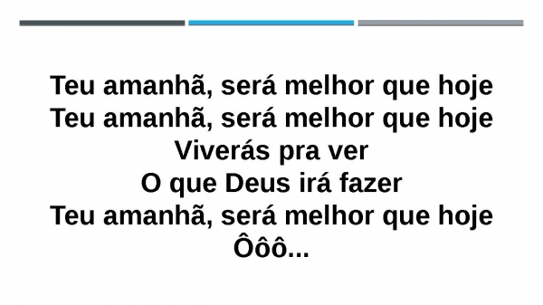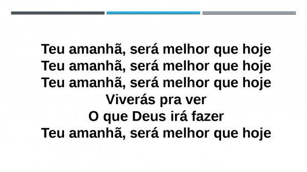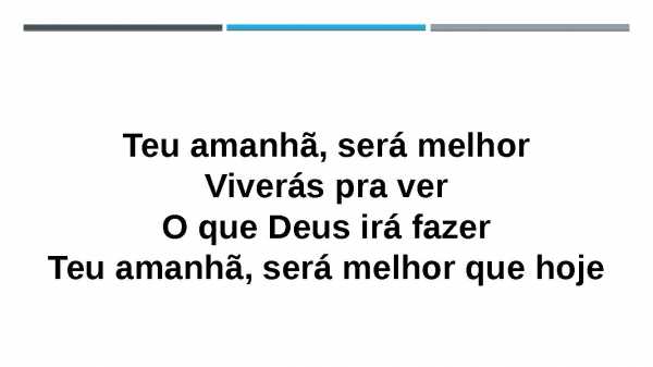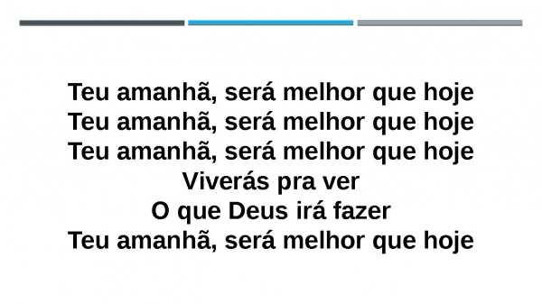 - Teu amanhã, será melhor que hojeTeu amanhã, será melhor que hojeTeu amanhã, será melhor que hojeViverás pra verO que Deus irá fazerTeu amanhã, será melhor que hoje