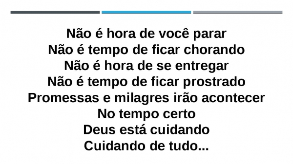 - Não é hora de você pararNão é tempo de ficar chorandoNão é hora de se entregarNão é tempo de ficar prostradoPromessas e milagres irão acontecerNo tempo certoDeus está cuidandoCuidando de tudo...