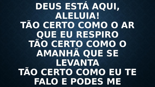 - Deus está aqui, aleluia!Tão certo como o ar que eu respiroTão certo como o amanhã que se levantaTão certo como eu te falo e podes me ouvir