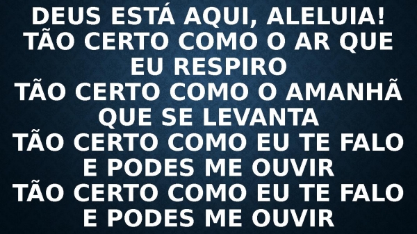 - Deus está aqui, aleluia!Tão certo como o ar que eu respiroTão certo como o amanhã que se levantaTão certo como eu te falo e podes me ouvirTão certo como eu te falo e podes me ouvir