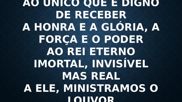 - Ao único que é digno de receberA honra e a glória, a força e o poderAo Rei eterno imortal, invisível mas realA Ele, ministramos o louvor