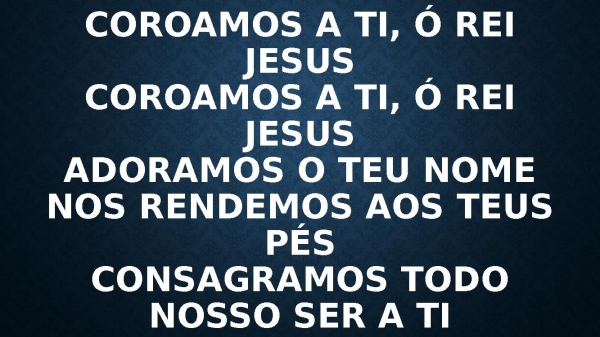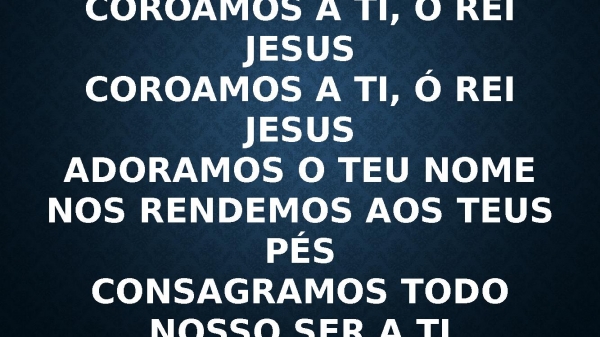 - Coroamos a Ti, ó rei JesusCoroamos a Ti, ó rei JesusAdoramos o Teu nomeNos rendemos aos Teus pésConsagramos todo nosso ser a ti