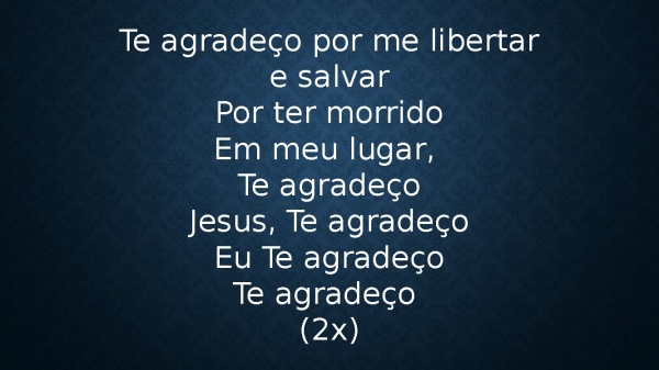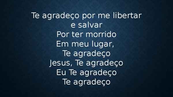- Te agradeço por me libertar e salvarPor ter morridoEm meu lugar, Te agradeçoJesus, Te agradeçoEu Te agradeçoTe agradeço