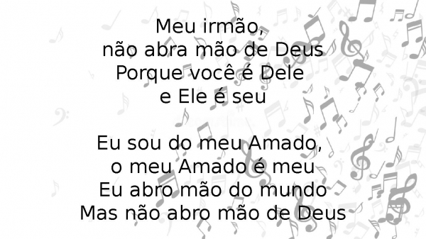 - Meu irmão, não abra mão de DeusPorque você é Dele e Ele é seuEu sou do meu Amado, o meu Amado é meuEu abro mão do mundoMas não abro mão de Deus