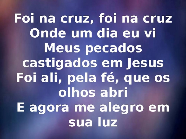 - Foi na cruz, foi na cruzOnde um dia eu viMeus pecados castigados em JesusFoi ali, pela fé, que os olhos abriE agora me alegro em sua luz