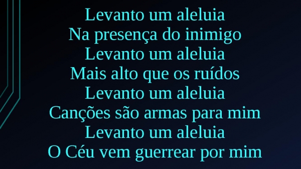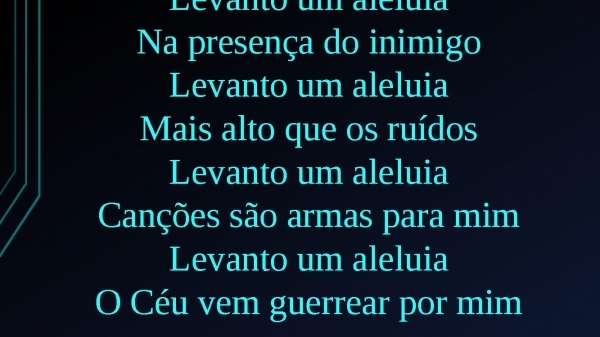 - Levanto um aleluiaNa presença do inimigoLevanto um aleluiaMais alto que os ruídosLevanto um aleluiaCanções são armas para mimLevanto um aleluiaO Céu vem guerrear por mim