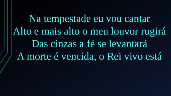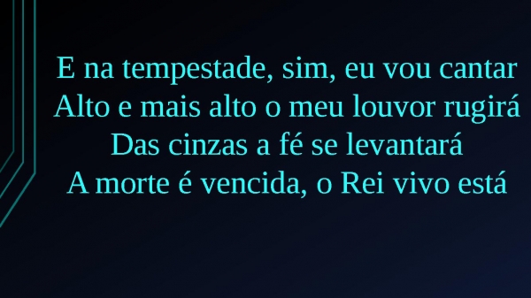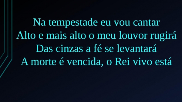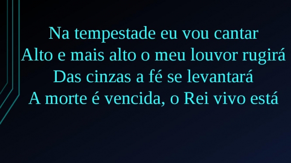- E na tempestade, sim, eu vou cantarAlto e mais alto o meu louvor rugiráDas cinzas a fé se levantaráA morte é vencida, o Rei vivo está