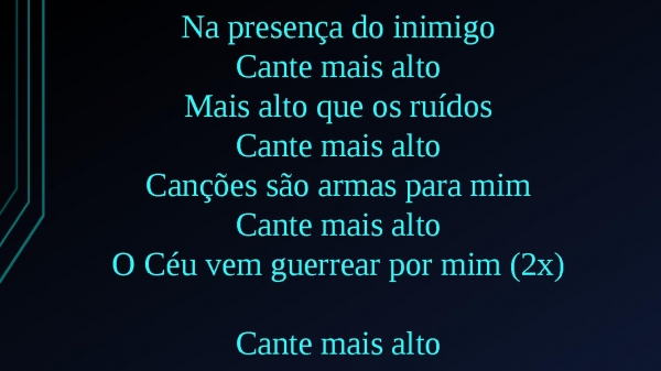 - Cante mais altoNa presença do inimigoCante mais altoMais alto que os ruídosCante mais altoCanções são armas para mimCante mais altoO Céu vem guerrear por mim (2x)Cante mais alto