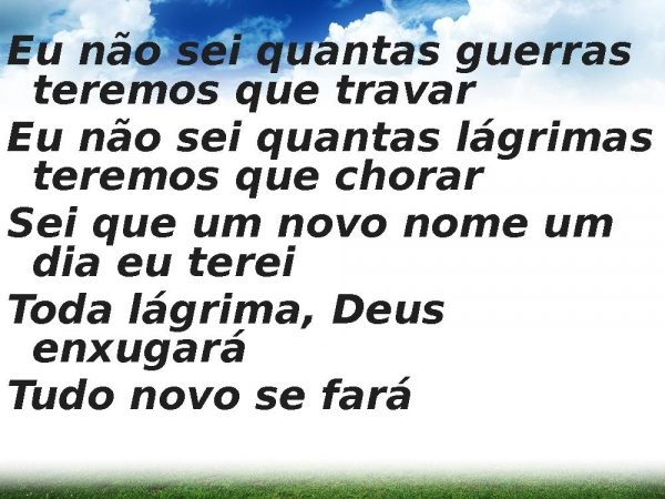 - Eu não sei quantas guerras teremos que travarEu não sei quantas lágrimas teremos que chorarSei que um novo nome um dia eu tereiToda lágrima, Deus enxugaráTudo novo se fará