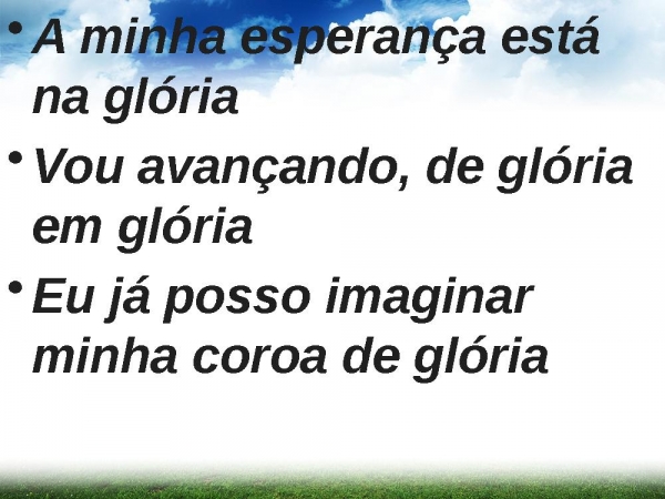 - A minha esperança está na glóriaVou avançando, de glória em glóriaEu já posso imaginar minha coroa de glória