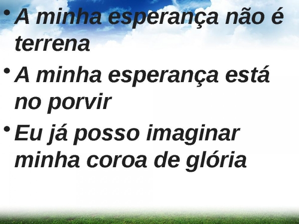 - A minha esperança não é terrenaA minha esperança está no porvirEu já posso imaginar minha coroa de glória