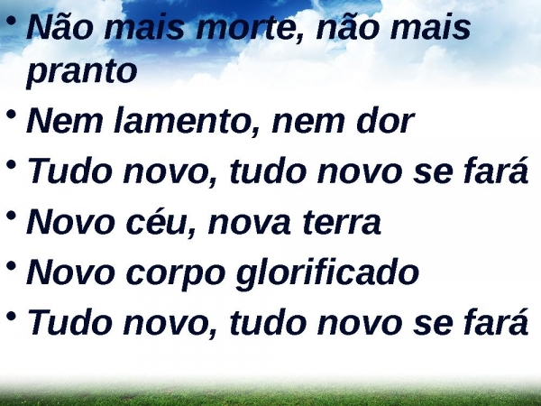 - Não mais morte, não mais prantoNem lamento, nem dorTudo novo, tudo novo se faráNovo céu, nova terraNovo corpo glorificadoTudo novo, tudo novo se fará