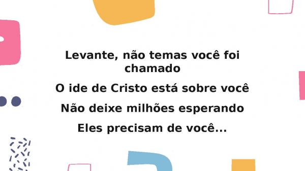- Levante, não temas você foi chamadoO ide de Cristo está sobre vocêNão deixe milhões esperandoEles precisam de você...