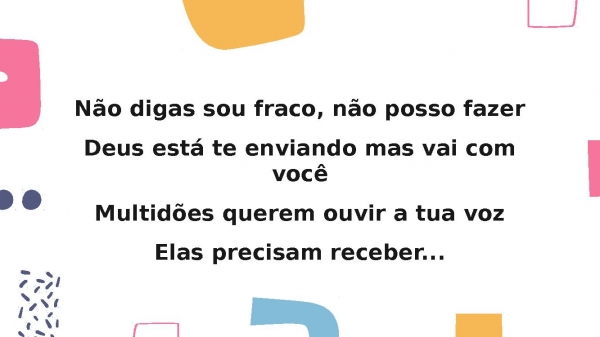 - Não digas sou fraco, não posso fazerDeus está te enviando mas vai com vocêMultidões querem ouvir a tua vozElas precisam receber...