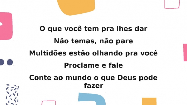 - O que você tem pra lhes darNão temas, não pareMultidões estão olhando pra vocêProclame e faleConte ao mundo o que Deus pode fazer