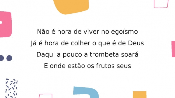 - Não é hora de viver no egoísmoJá é hora de colher o que é de DeusDaqui a pouco a trombeta soaráE onde estão os frutos seus