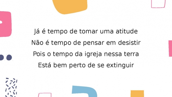 - Já é tempo de tomar uma atitudeNão é tempo de pensar em desistirPois o tempo da igreja nessa terraEstá bem perto de se extinguir