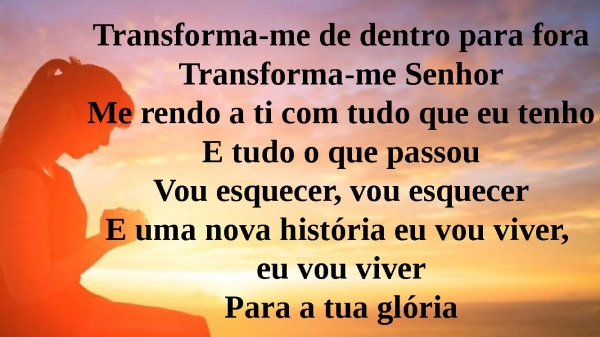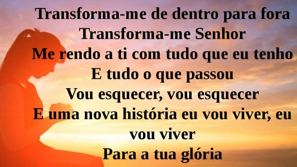 - Transforma-me de dentro para foraTransforma-me SenhorMe rendo a ti com tudo que eu tenhoE tudo o que passouVou esquecer, vou esquecerE uma nova história eu vou viver, eu vou viverPara a tua glória