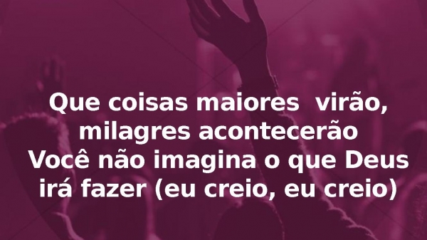 - Que coisas maiores virão, milagres acontecerãoVocê não imagina o que Deus irá fazer (eu creio, eu creio)