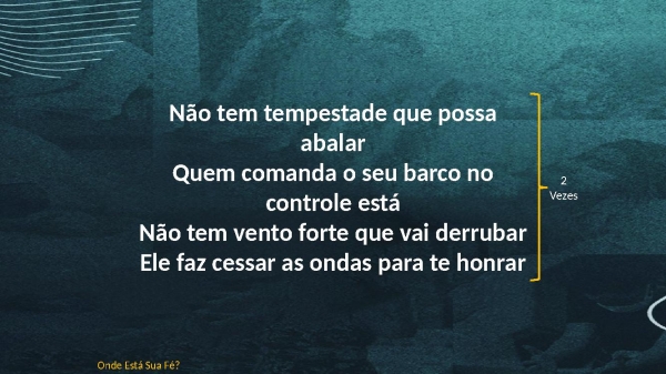 - Não tem tempestade que possa abalarQuem comanda o seu barco no controle estáNão tem vento forte que vai derrubarEle faz cessar as ondas para te honrarOnde Está Sua Fé?2Vezes
