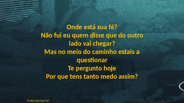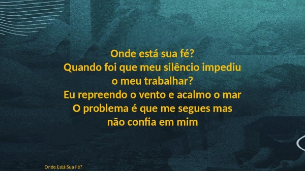 - Onde está sua fé?Quando foi que meu silêncio impediu o meu trabalhar?Eu repreendo o vento e acalmo o marO problema é que me segues mas não confia em mimOnde Está Sua Fé?
