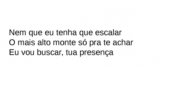 - Nem que eu tenha que escalarO mais alto monte só pra te acharEu vou buscar, tua presença