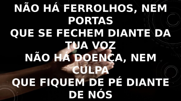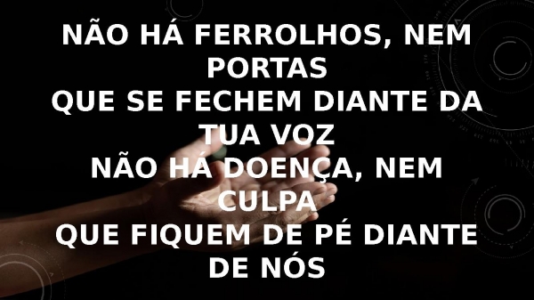 - Não há ferrolhos, nem portasQue se fechem diante da tua vozNão há doença, nem culpaQue fiquem de pé diante de nós
