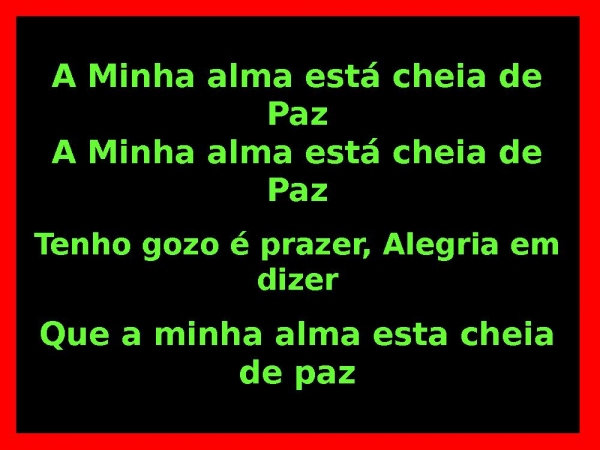 - A Minha alma está cheia de PazA Minha alma está cheia de PazTenho gozo é prazer, Alegria em dizerQue a minha alma esta cheia de paz