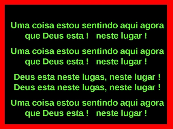 - Uma coisa estou sentindo aqui agoraque Deus esta ! neste lugar ! Uma coisa estou sentindo aqui agoraque Deus esta ! neste lugar ! Deus esta neste lugas, neste lugar !Deus esta neste lugas, neste lugar !Uma coisa estou sentindo aqui agoraque Deus esta ! neste lugar !