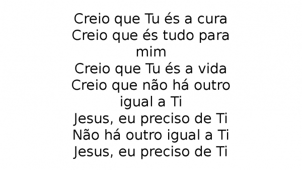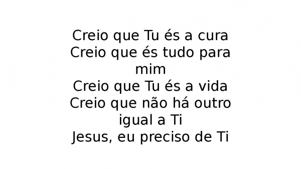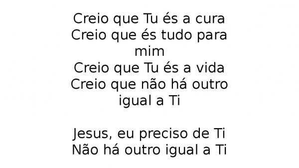 - Creio que Tu és a curaCreio que és tudo para mimCreio que Tu és a vidaCreio que não há outro igual a TiJesus, eu preciso de Ti