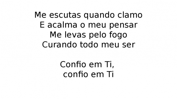 - Me escutas quando clamoE acalma o meu pensarMe levas pelo fogoCurando todo meu serConfio em Ti, confio em Ti