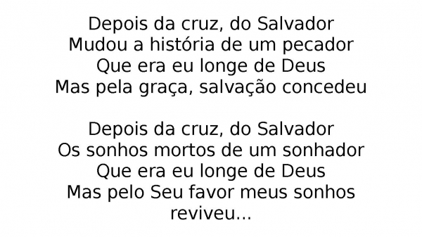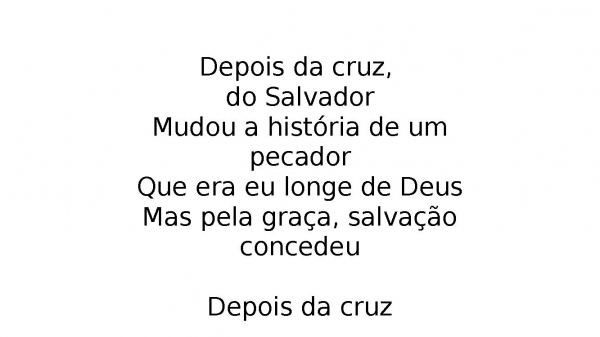- Depois da cruz, do SalvadorMudou a história de um pecadorQue era eu longe de DeusMas pela graça, salvação concedeuDepois da cruz
