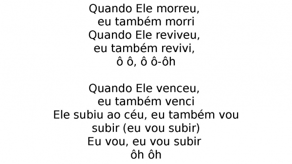 - Quando Ele morreu, eu também morriQuando Ele reviveu, eu também revivi, ô ô, ô ô-ôhQuando Ele venceu, eu também venciEle subiu ao céu, eu também vou subir (eu vou subir)Eu vou, eu vou subir ôh ôh