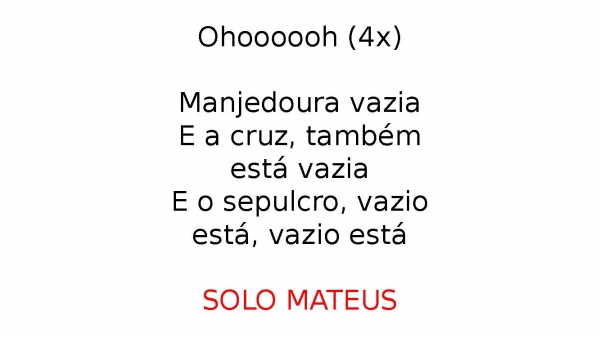 - Ohoooooh (4x)Manjedoura vaziaE a cruz, também está vaziaE o sepulcro, vazio está, vazio estáSOLO MATEUS
