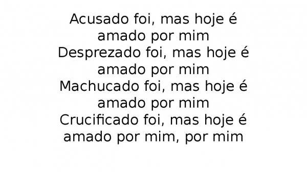 - Acusado foi, mas hoje é amado por mimDesprezado foi, mas hoje é amado por mimMachucado foi, mas hoje é amado por mimCrucificado foi, mas hoje é amado por mim, por mim