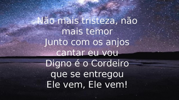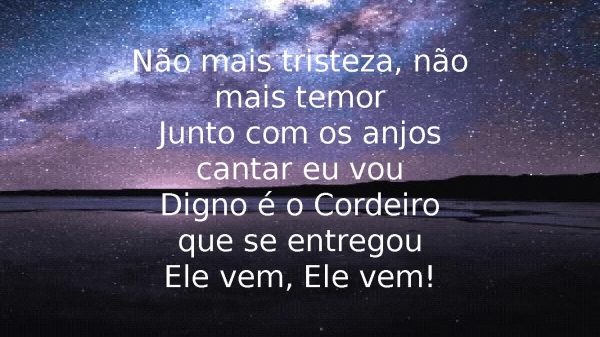 - Não mais tristeza, não mais temorJunto com os anjos cantar eu vouDigno é o Cordeiro que se entregouEle vem, Ele vem!