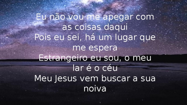 - Eu não vou me apegar com as coisas daquiPois eu sei, há um lugar que me esperaEstrangeiro eu sou, o meu lar é o céuMeu Jesus vem buscar a sua noiva
