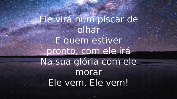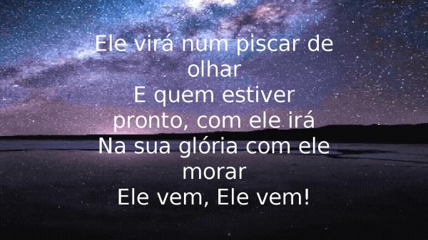 - Ele virá num piscar de olharE quem estiver pronto, com ele iráNa sua glória com ele morarEle vem, Ele vem!