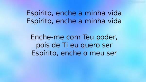 - Espírito, enche a minha vidaEspírito, enche a minha vidaEnche-me com Teu poder, pois de Ti eu quero serEspírito, enche o meu ser(2x)